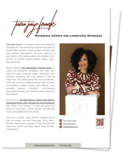 As founder and CEO of the human-centered culture and leadership firm The Waymakers Change Group (TWCHG), Tara has advised and educated thousands of Fortune 500 executives across multiple industries and large member organizations. Before founding TWCHG, Tara spent twenty-one years at Hallmark, where she served in multiple executive roles, including Vice-President Creative Writing and Editorial, Vice-President Business Innovation, Vice-President Multicultural Strategy, and Corporate Culture Advisor to the President. Her last book, The Waymakers: Clearing the Path to Workplace Equity with Competence and Confidence (GOLD Medal in Leadership, Axiom Business Book Awards 2022), is an invitation to all people with power and position to open doors, remove barriers, and facilitate opportunity for those who have been historically denied.